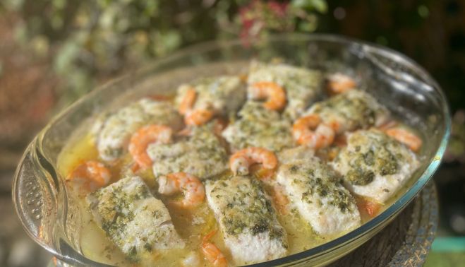Lleva una base de patatas, verduras en rodajas, el pescado, en este caso en rodajas y una picada. Por supuesto, condimentado todo con vino de Jerez, que le da un sabor muy especial y muy rico, y cocinado al horno. Como novedad, le hemos agregado langostinos, que le vienen muy bien.