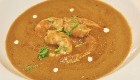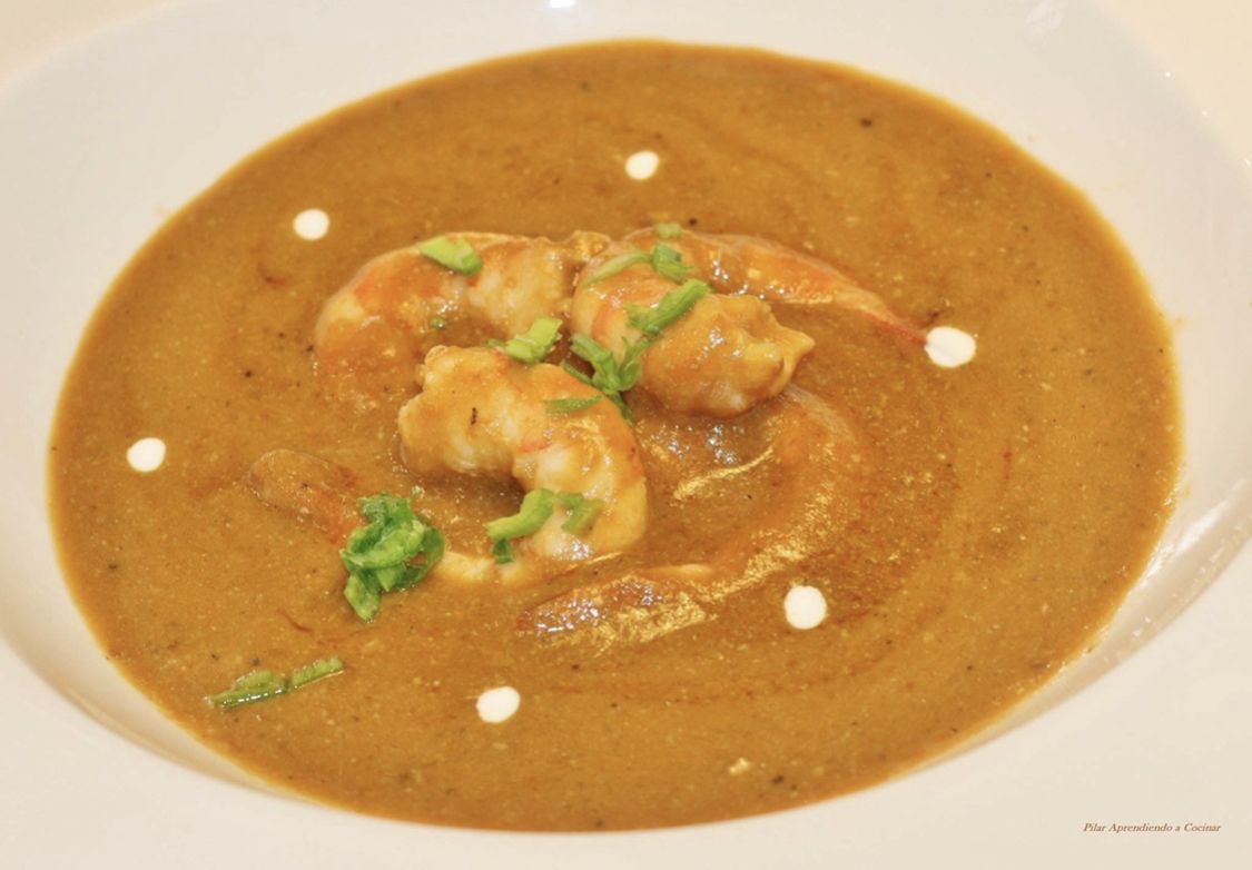 Nos cuenta nuestra amiga Wikipedia, que se llama bisqué a una sopa velouté, cremosa y muy condimentada de origen francés, elaborada clásicamente a partir de un coulis de crustáceos. Puede hacerse de langosta, bogavante, cangrejo, gamba o cangrejo de río. Nosotras la hemos preparado con langostinos. Suele servirse fría o caliente.