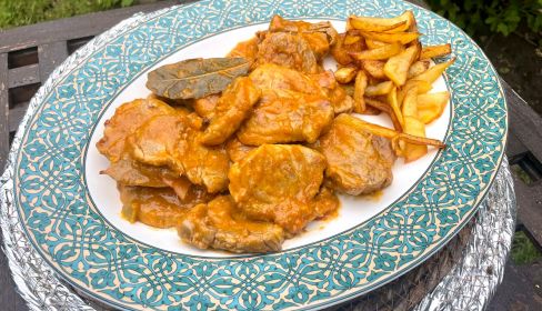 Colocamos los medallones con su salsa en una fuente, y para acompañar, nada mejor que unas buenas patatas fritas, patatas rehogadas al horno, un molde de arroz, un molde de cuscús… Lo que más os guste en casa.