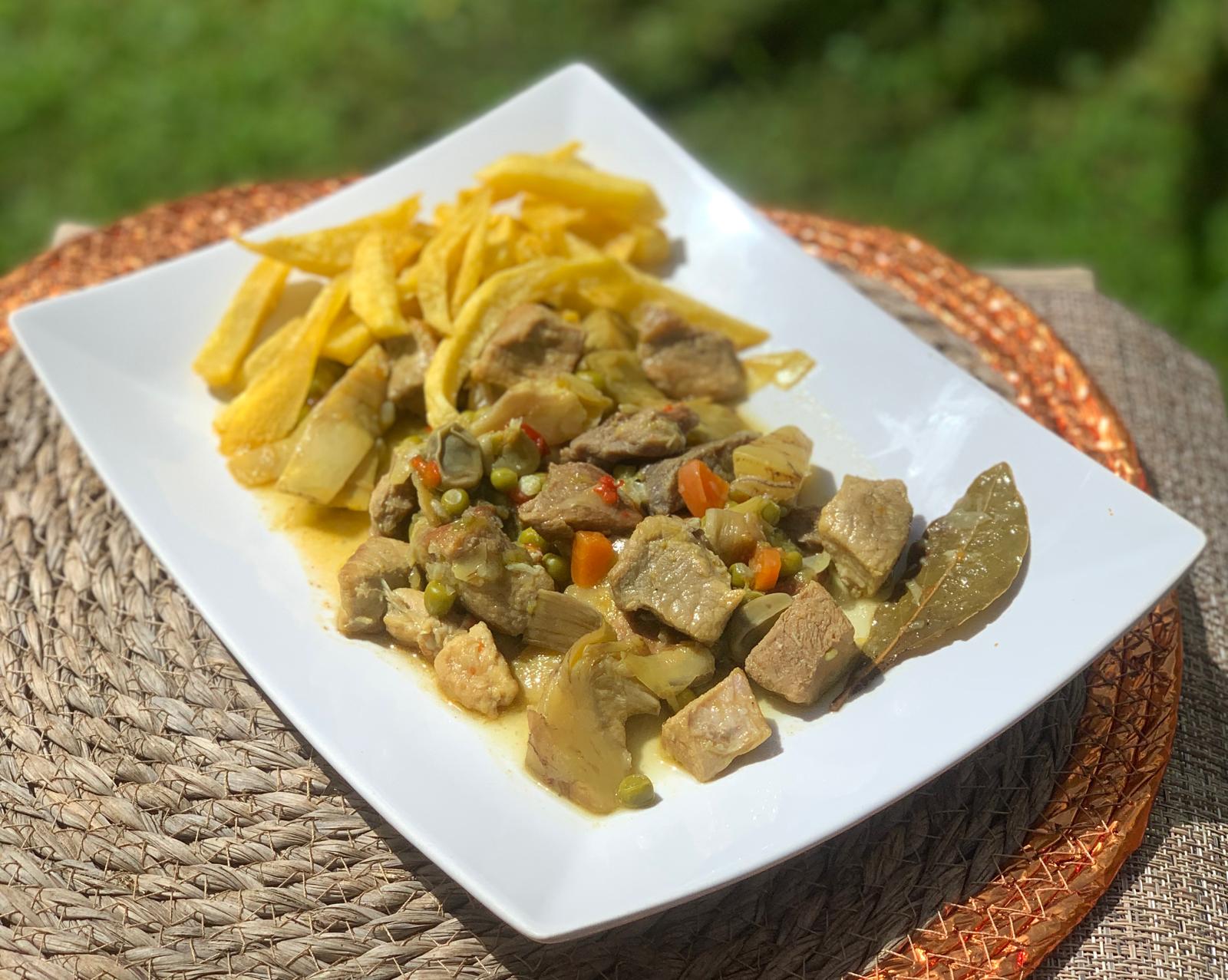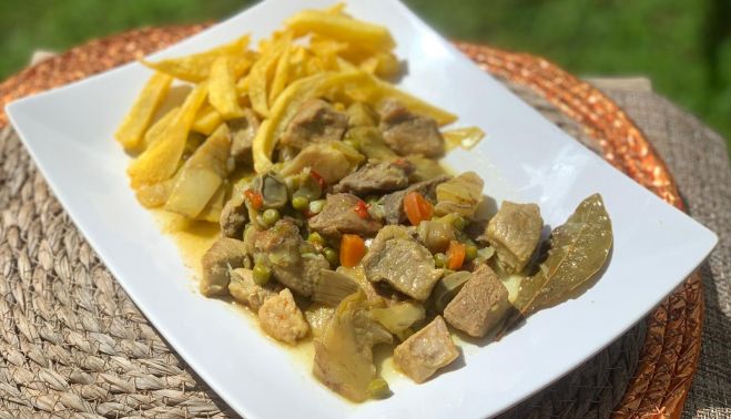El siguiente paso consiste en preparar una mezcla en un mortero, con ajos, pimienta en grano, sal, azafrán, colorante y vino blanco, que se combina con una pastilla de caldo de carne. Este preparado se agrega a la sartén con la carne y se deja que los sabores se integren mientras se continúa con la cocción. El plato se sirve acompañado de patatas fritas, lo que completa el guiso, proporcionando un contraste crujiente y sabroso.