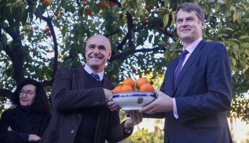 El alcalde de Sevilla, Antonio Muñoz, ha hecho entrega al embajador de Reino Unido en España, Hugh Elliott, de 30 kilos de naranjas amargas procedentes de este histórico jardín situado en el centro de la ciudad.
