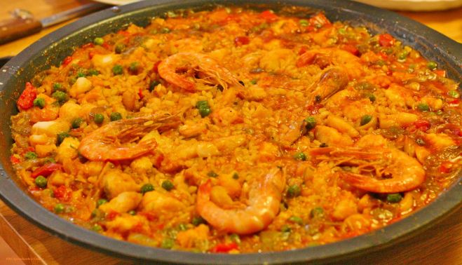 * Una vez pasados los 8 minutos, bajamos el fuego, añadimos las gambas peladas, los taquitos de rape y de choco reservados. Decoramos con las gambas reservadas y continuamos cocinando hasta que el arroz quede “al dente” y bien sequito.