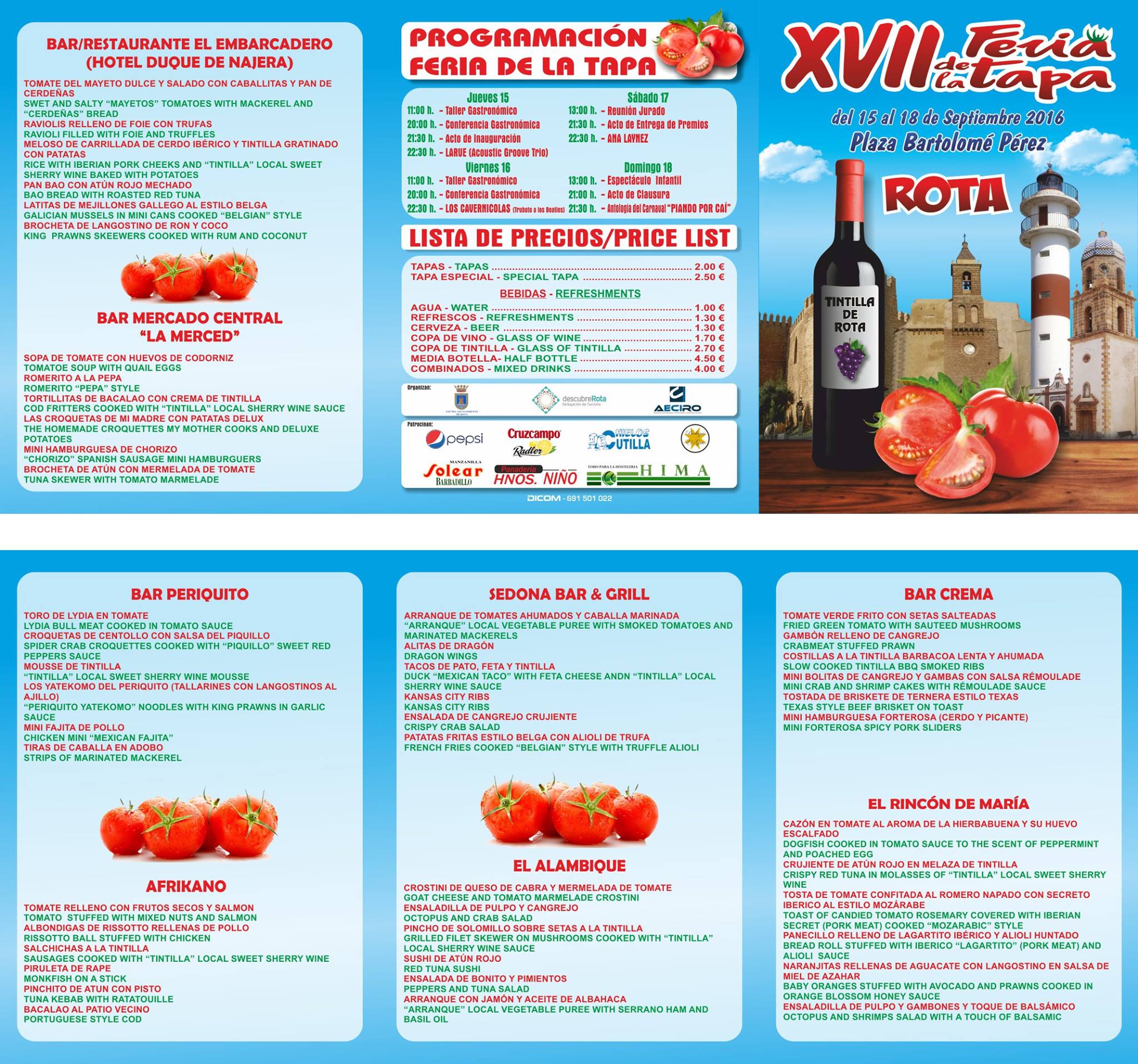 Aprovechamos para contaros que desde el próximo jueves 15 hasta el domingo 18 de septiembre se celebra en Rota la XVII de la Feria de la Tapa en la que participan ocho restaurantes de la ciudad ofreciendo cada uno ocho tapas, una de las cuales ha de estar elaborada con vino dulce tintilla de Rota y otra con tomate, ingrediente al que se dedica la feria en esta edición. Compartimos el folleto con toda la información para que la podáis disfrutar al máximo.
