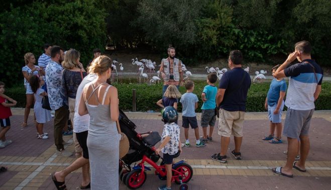 Con el cupo de 50 plazas cubiertas, Luis Rodríguez, guía turístico y técnico de veterinaria, es el encargado de guiar al grupo durante la visita al Zoobotánico de Jerez. Esta actividad se lleva a cabo una vez que el parque cierra sus puertas al público, quedando exclusivamente reservado para el grupo asistente. “El objetivo de estas visitas es promover la concienciación de la fauna y la vida del Zoológico en verano”, aclara Luis.