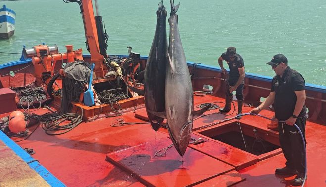 Los 29 primeros atunes rojos capturados en esta primera acción, correspondiente a la almadraba Punta Atalaya de Conil, han sido descargados en el puerto de Barbate y, a continuación, ronqueados directamente, como se denomina a la técnica tradicional de despiece artesanal de estos pescados.