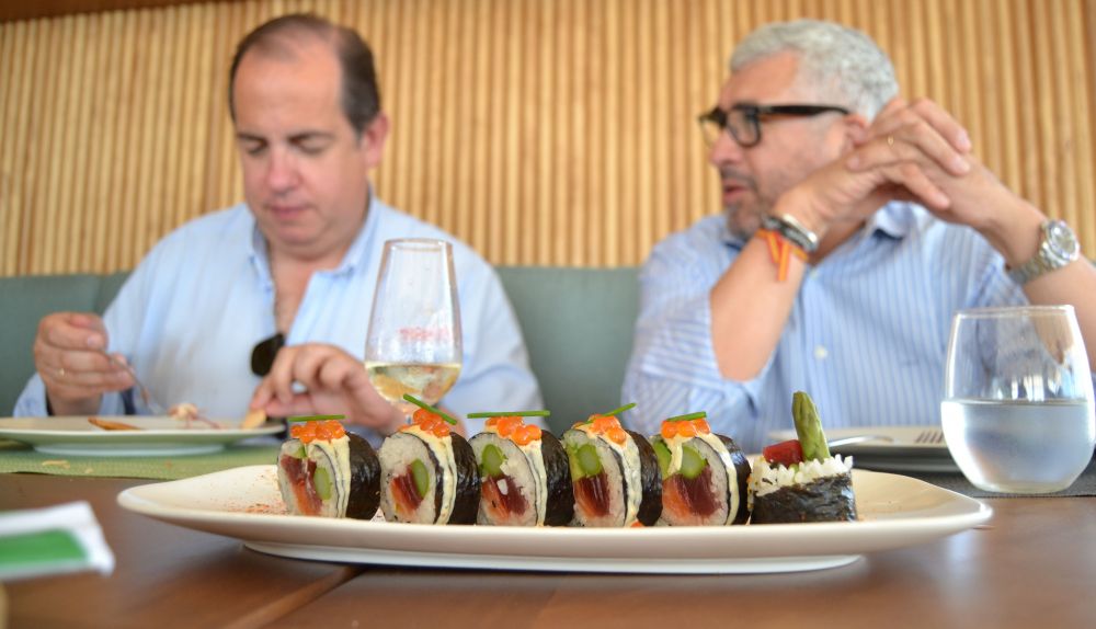 El fresco de esta primera semana de junio hace que el aspecto de los salones de Awa, con capacidad para doscientos comensales, sea más bien tranquilo. Desde luego, no va a tener nada que ver cuando en pleno verano la población habitual de localidad, de 19.000 habitantes, se multiplique por diez. Observo una mesa ocupada por un grupo de periodistas locales y sevillanos y otra más en la que almuerzan un joven matrimonio y sus dos hijos pequeños. El resto, disfrutan tranquilamente del sol en la terraza porticada situada en un lateral del chiringuito. Sopla algo de poniente, el mar está como un plato y algunos bañistas inauguran la temporada tímidamente.