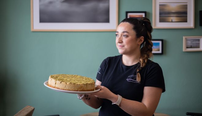 Su hija hace una foto a una tarta de queso de pistacho mientras Juanma coloca la mercancía. “Ha sido un negocio muy pensado y hecho con mucho cariño”, dice Marian, que, aunque tenía experiencia en elaboración, no había emprendido nunca y tuvo que formarse.