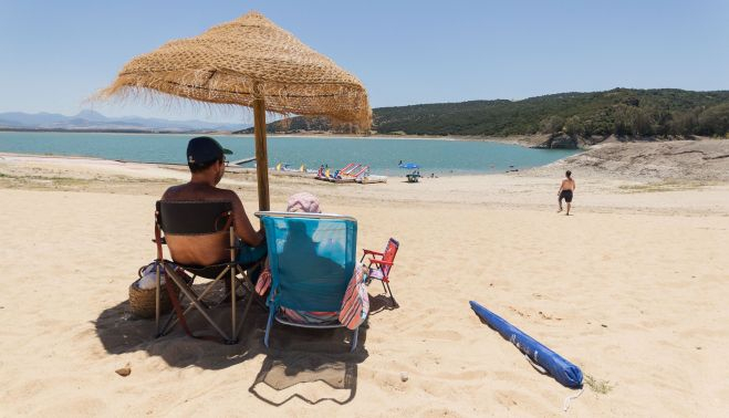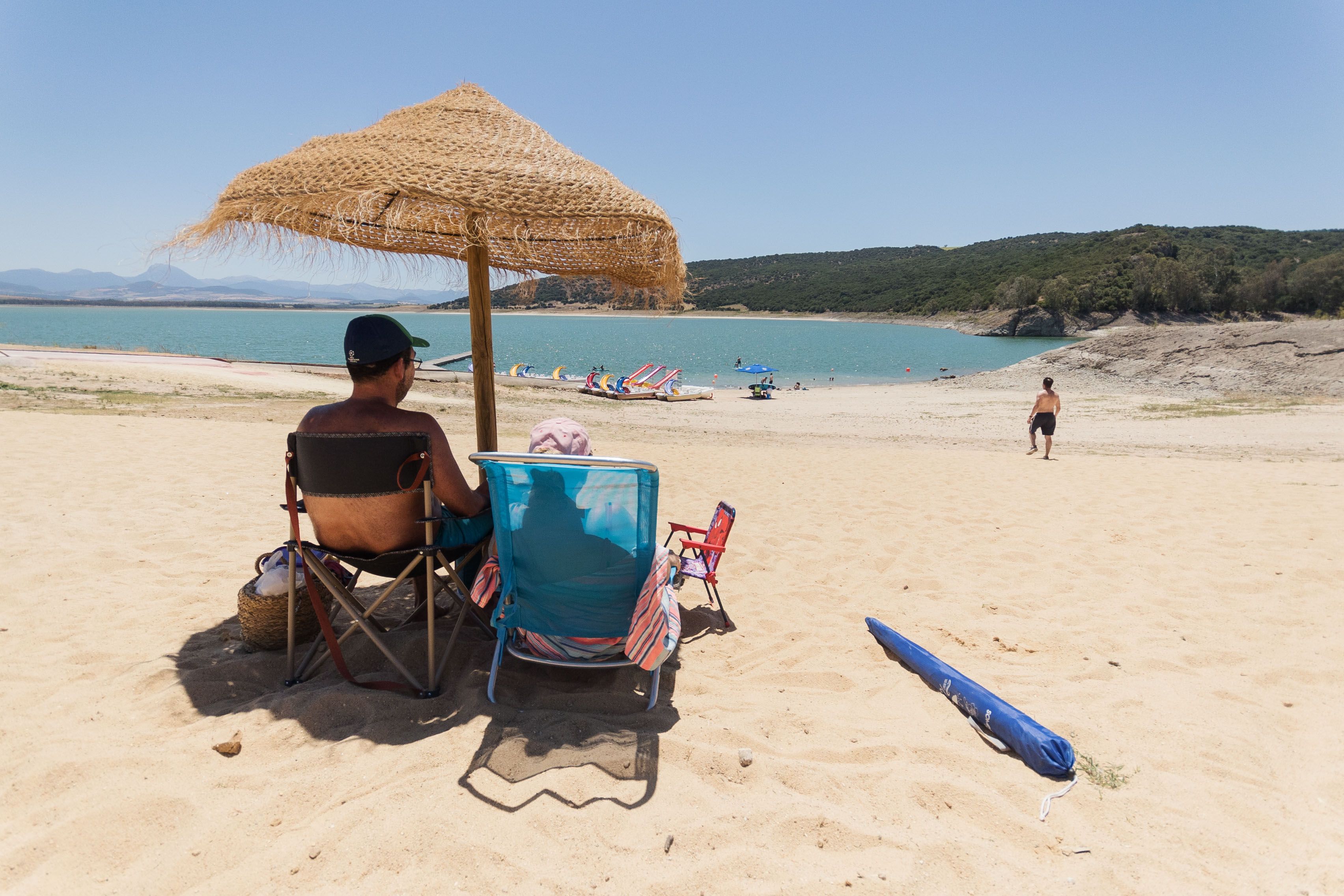 Jony y Patri, ubicados unos metros más arriba, debajo de una sombrilla de paja, vienen desde el pueblo sevillano de Las Cabezas de San Juan. "La playita de Arcos estaba a tope, muy masificada, y vinimos para acá", cuenta él. Ambos, ataviados con la nevera, donde llevan las bebidas y unos buenos bocadillos de chorizo, pretenden "echar el día". "Hasta las ocho mínimo estaremos", puntualiza Patri. Junto a ellos descansa una tabla de paddle surf, que casi están estrenando, que acaban de hinchar, y que prueban poco más tarde en las aguas del pantano.