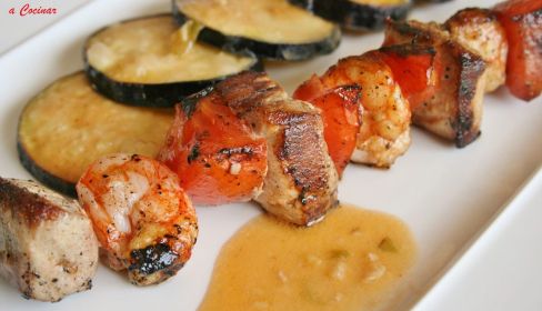 * Cocinamos las brochetas a la plancha y cuando estén listas. Colocamos en un plato, junto con la salsa y las berenjenas fritas a las que habremos añadido un chorreoncito de miel.