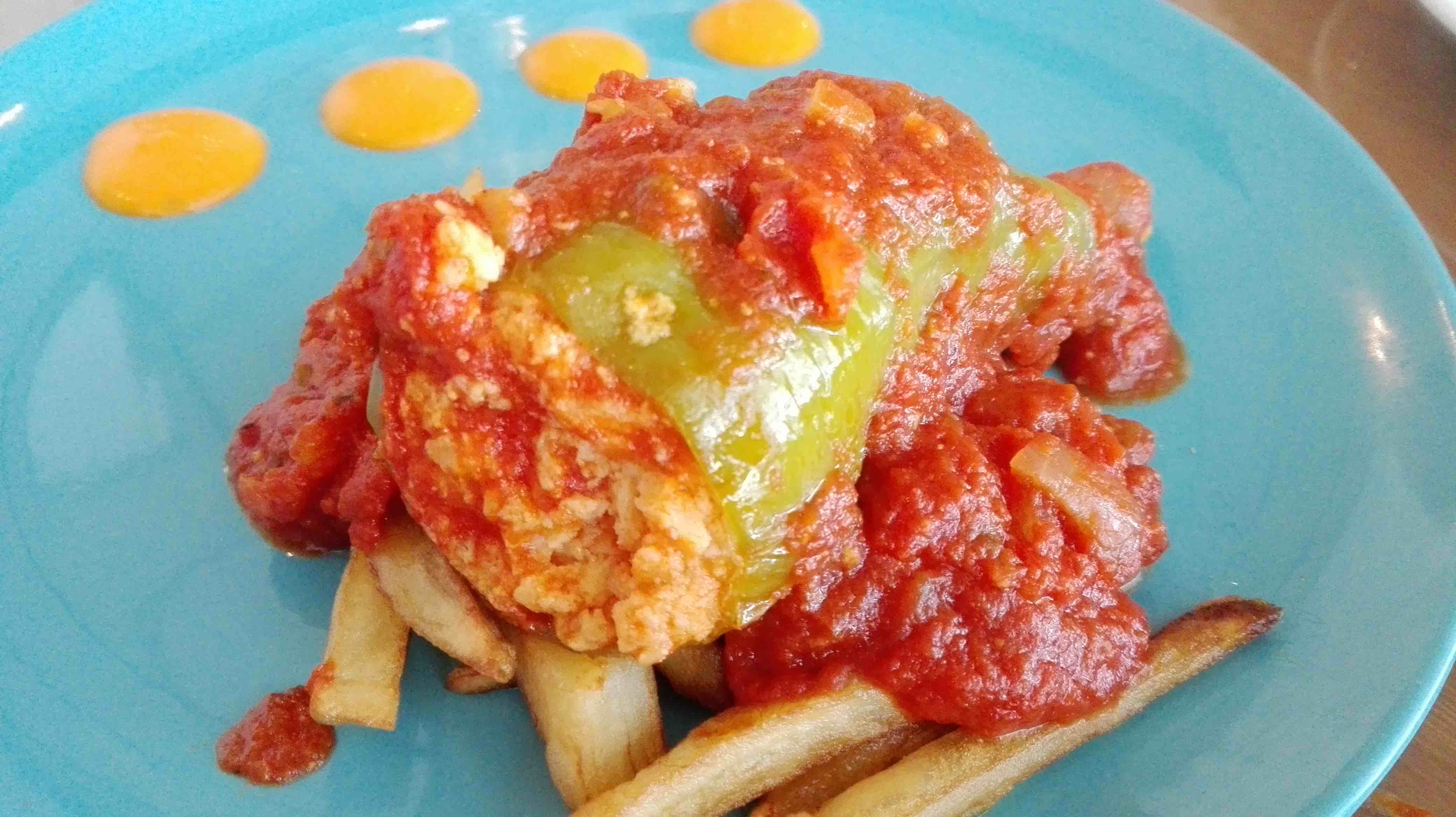 He perdido la cuenta de las cestas de pan que nos han traído. Como cuando éramos niños, toda la mesa está llena de migas esparcidas. Queda un plato que únicamente acertamos a catar, porque el volumen de la cata ha sido importante. Se trata del famoso pimiento relleno de tortilla que ofrecen fuera de carta. Cómo no, está salseado con tomate frito y le acompañan, como a los platos anteriores, unas patatas al bastón tan caseras como todo lo demás. Original.
