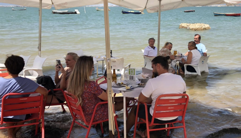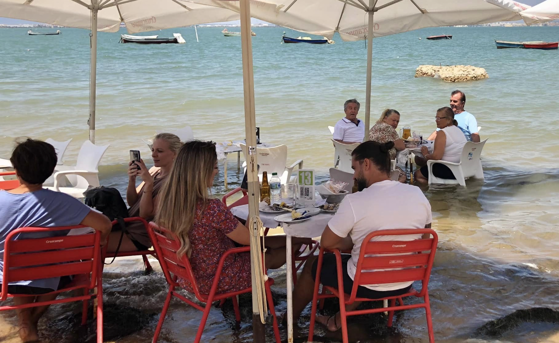 Estos días, de hecho, se han popularizado en las redes, en el grupo de Facebook Viajar en Cádiz, imágenes de clientes de Casa Bartolo que comían pescaíto frito y otros manjares de la casa con los pies en remojo, algo muy habitual cuando empieza a subir la marea y las mesas en plena arena cubren sus patas de agua salada.