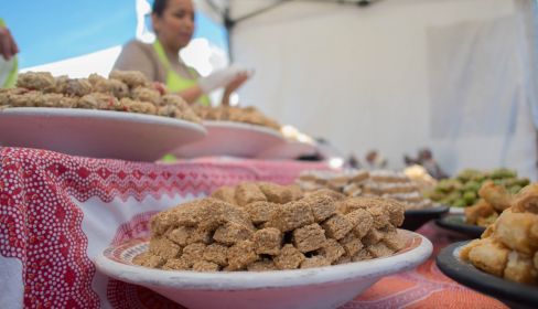 La plaza del Mamelón se queda corta y muchos se ven obligados a moverse por los adoquines. Es la una de la tarde. El sol reluce y espanta al frío, por lo que la gente sale a la calle para disfrutar de Andalucía Productores, un mercado que alberga los mejores productos locales de toda Andalucía en Jerez hasta el 10 de diciembre. "¡Niña! ¿A cuánto está el cuarto de eso?", pregunta una veterana mientras señala un dulce árabe. Hojaldres, pistacho, cacahuetes, miel, almendras... Huele a dulce y la gente se abarrota en el puesto sevillano del Obrados-pastelería árabe de Malake Akbour. Esta joven marroquina de 26 años lleva al frente de su negocio desde hace tres años. Su compañera, Lucila Sánchez, natural "de la República Independiente de Triana (Sevilla)", bromea, dice que Malake se ha estudiado diferentes cursos de cocina en España, pero que también se trajo consigo el recetario de repostería de su casa. "¿Eso qué es niña?", vuelve a preguntar la mujer mientras Malake coloca sus delicados y ricos dulces en pequeñas bandejitas. Está tan solicitada que ni tiempo tiene de constestarle. "Unos alfajores árabes", murmura una, al tiempo en que la mujer ríe.