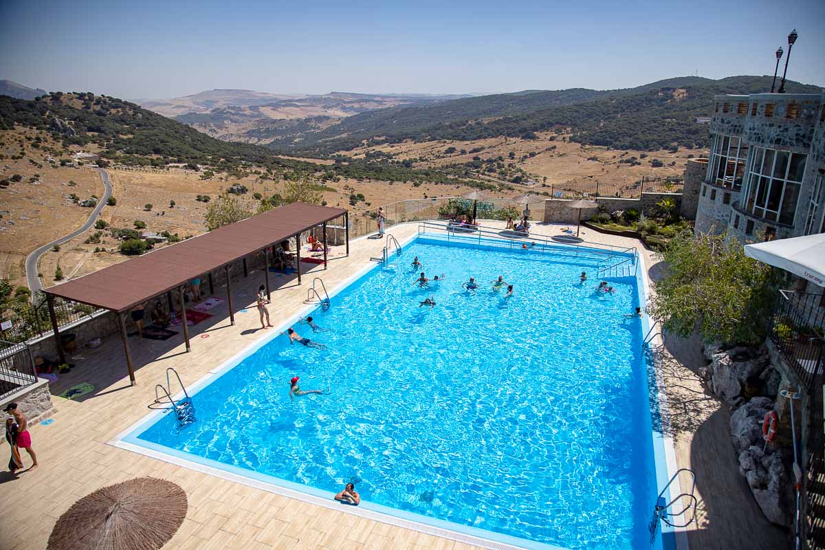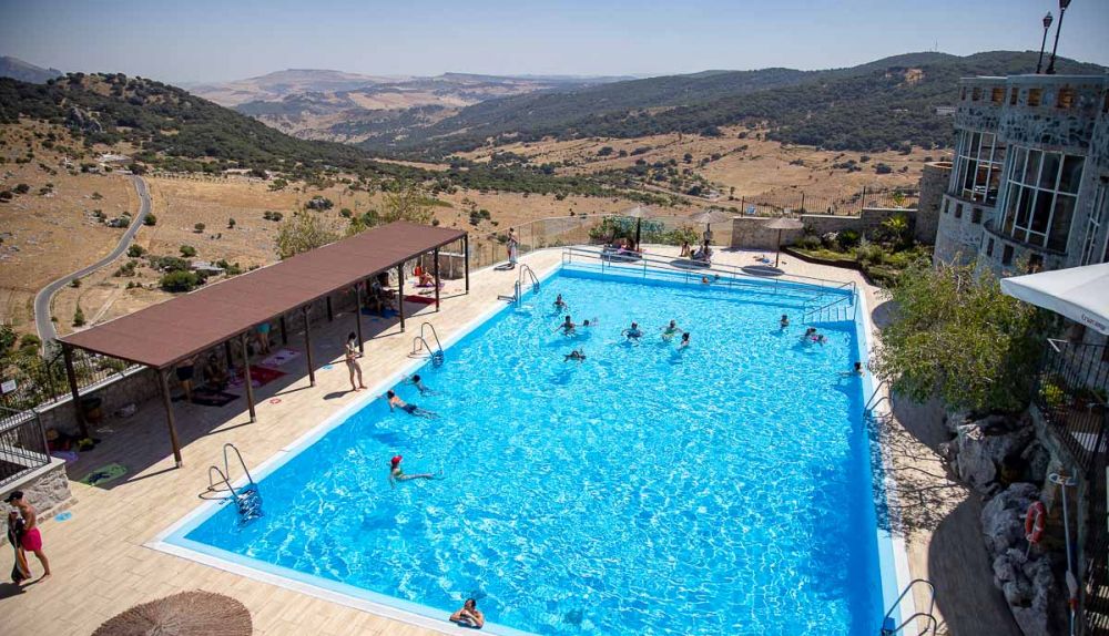 La piscina municipal de Grazalema se encuentra en el emblemático Tajo, un enclave natural espectacular desde el que se puede contemplar el vuelo de águilas reales mientras se está en la piscina. Al entrar, bajando unas escaleras, espera Clara Calvillo, una de las socorristas. “Medimos la temperatura corporal, obligamos a la gente a que se lave las manos, pase los pies por una alfombra desinfectante, a desinfectar sillas o tumbonas que traigan de casa, a llevar mascarilla si van al baño o al bar y a ponerse en las pegatinas que hay en el suelo para respetar las distancias”, explica. La piscina tiene este verano dos turnos, mañana (11:00 a 15:00 horas) y tarde (16:00 a 20:00 horas), en los que el aforo está reducido a 50 personas en cada uno. “Los baños y las duchas se limpian cada vez que las usa alguien”, insiste, recalcando la seguridad de un entorno con vistas únicas.
