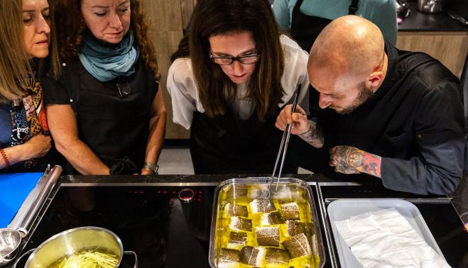 En ellos enseñan la cocina de diferentes países, como platos griegos, hindúes o mexicanos, y pastelería sin gluten, comida vegetariana, fusión o arroces. “Los talleres tienen un doble componente, uno es la experiencia de cocinar y hacer las recetas y otro, degustar todo lo que han cocinado ellos con bebida incluida”, explica Pablo rodeado de personas que se sientan en la mesa para probar la carne o el pescado recién cocinado.