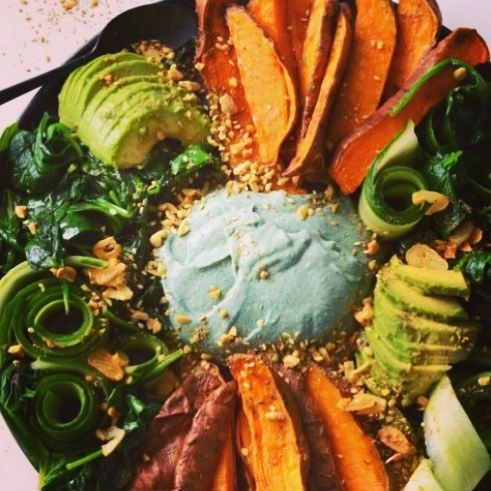 Bowl de hummus con boniato al horno, espinacas con ajo, pepino y aguacate. Comida saludable en Coso.