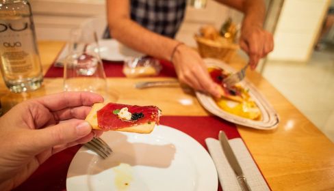 Los langostinos están presentes en platos como el arroz negro meloso con choco y langostinos. Tampoco hay que obviar sus croquetas de carabineros, una receta tradicional de la familia que nunca se separa de ellos en cada proyecto, y el tarantelo de atún rojo en salsa de ostras con verdura escabechada.