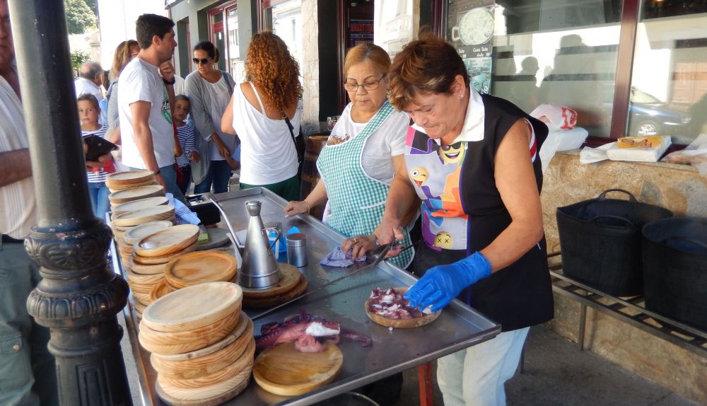 Muy cerca, en Casa Tato, dos pulpeiras de las que van recorriendo la región de pueblo en pueblo y de feria en feria, tienen ya montado su puesto. Una gran mesa rectangular de aluminio sobre la que descansan decenas de platos de madera, una alcuza con aceite, el pimentón y en un lateral una gran olla donde cuece el pulpo.