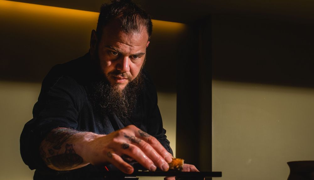 Con Cerdá pasamos al interior del restaurante y lo primero que invade al que entra en ese bonito espacio es una sensación de relax, quietud y calidez que transmiten sus luces indirectas, las maderas claras de su decoración, con esa original configuración en las paredes del salón como un mar de sombrillas vistas desde arriba, la suave música ambiental y, algo muy importante, las agradables sensaciones aromáticas. La sala del fondo cuenta con diez mesas para comer sentados. Presenta a su equipo. Entre ellos, el sumiller, Manu Soler y el jefe de cocina, itamae de la barra omakase con seis plazas donde nos acomodamos, el sevillano Pedro González.