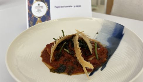 Pagel en tomate y algas. Ingredientes: Pagel, tomate, cebolla pimiento verde, ajo, lechuga de mar, salicornia, patatas, sal y vino blanco.