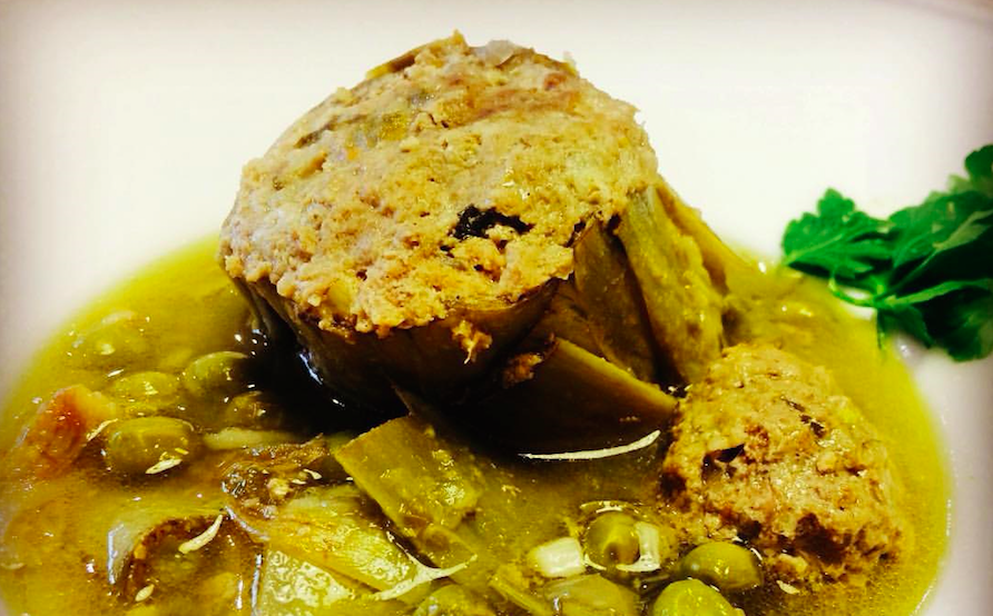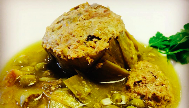 * A continuación vamos a escurrir las alcachofas y las rellenamos con esta masa preparada. Si nos sobra vamos a preparar unas pequeñas albondiguitas que añadiremos al guiso.