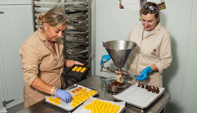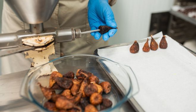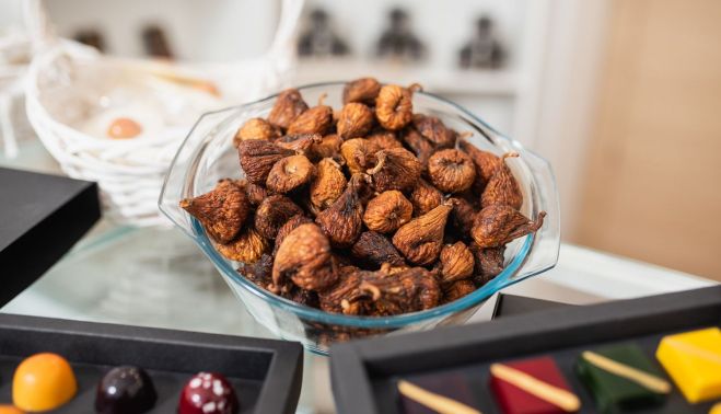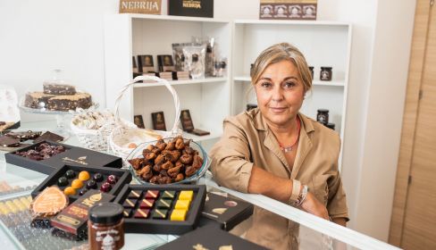 Precisamente los higos secos que son la base de la bombonera fueron los primeros en convertirse en un original bombón con forma de lágrima al ser bañados de chocolate. Pero es que, además de la cobertura, el chocolate se le aplica a cada higo, uno por uno, con una inyectora que lo va preñando de sabor por dentro, de modo que cada fruto, que ya es en sí mismo un conjunto de frutos y por eso se considera una infrutescencia, termina colmado de chocolate externa e internamente, y su bocado requiere de tanta atención con los cinco sentidos que no extraña que estas “lágrimas de Nebrija”, como se terminó bautizando el producto, sea la auténtica estrella del negocio.