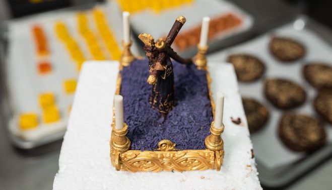 El negocio creció tanto a la vuelta del siguiente año, que hasta abrieron una tienda en Sevilla porque los pasos cofrades de chocolate y totalmente comestibles del Nazareno de Lebrija, de la Virgen de la Soledad o de Nuestro Padre Jesús Atado a la Columna (con precios que podían superar los 200 euros) no tardaron en llamar poderosamente la atención en la capital. Ese establecimiento se terminó cerrando no porque no tuviera éxito, “sino por motivos personales”, dice un tanto compungida Loli. Luego revela su dolor por la muerte de su hermano en aquellos últimos coletazos del covid. “Era mi hermano preferido”, reconoce, y esconde la mirada en las cajitas que sigue preparando, mientras Eva vuelca el chocolate fundido en la inyectora para los higos.