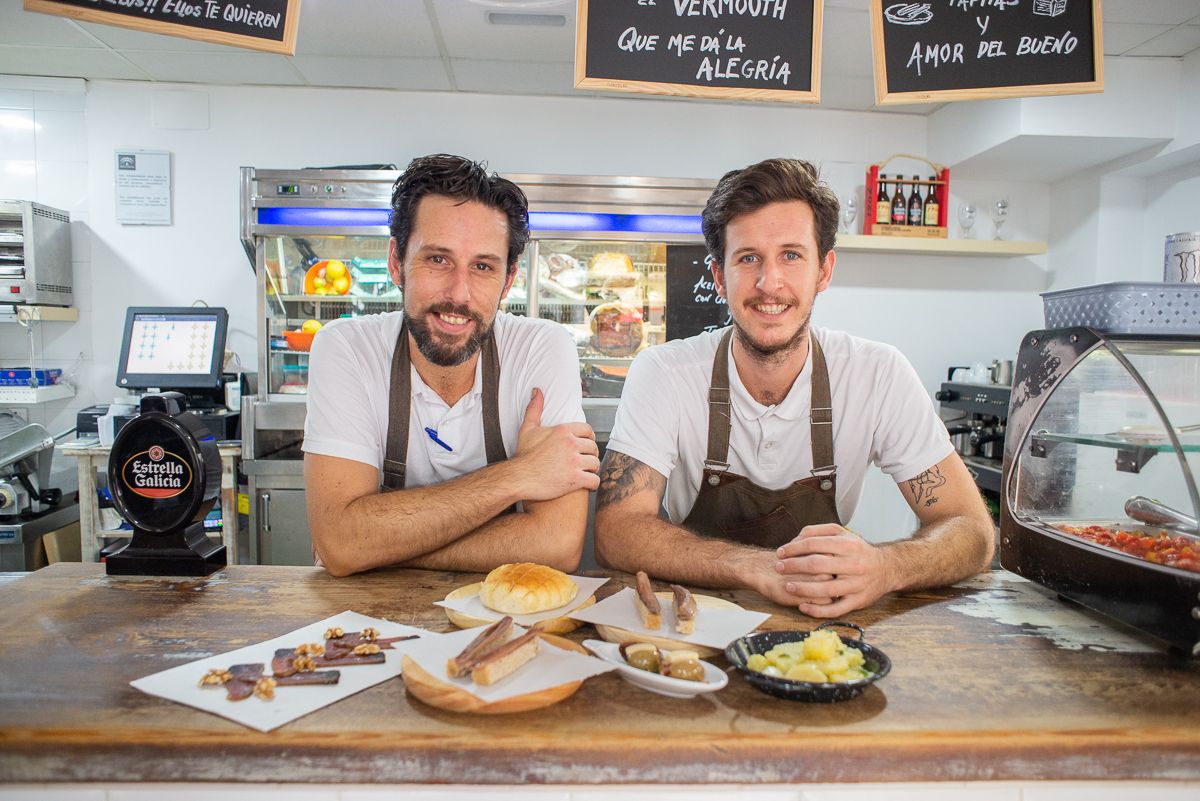 En apenas mes y medio con las puertas abiertas ya les conocen en la zona como los niños de Aladro. A ellos les entusiasma porque significa que rápidamente los clientes han identificado este córner entre Eguiluz y plaza Aladro, una de las zonas más bonitas del centro de Jerez, y que, además, han sido acogidos con mucho cariño. Ramón y Eliseo Benítez Aránega son dos hermanos jerezanos de 41 y 31 años, respectivamente, que hace mucho que dejaron de ser niños, pero que, en el fondo, siguen recordando como si fueran críos cuando iban de la mano del abuelo hasta la barra de cualquiera de esos gloriosos bares de barrio a probar unas papas aliñás o un bocado de chicharrón que pringaba el papel de estraza.