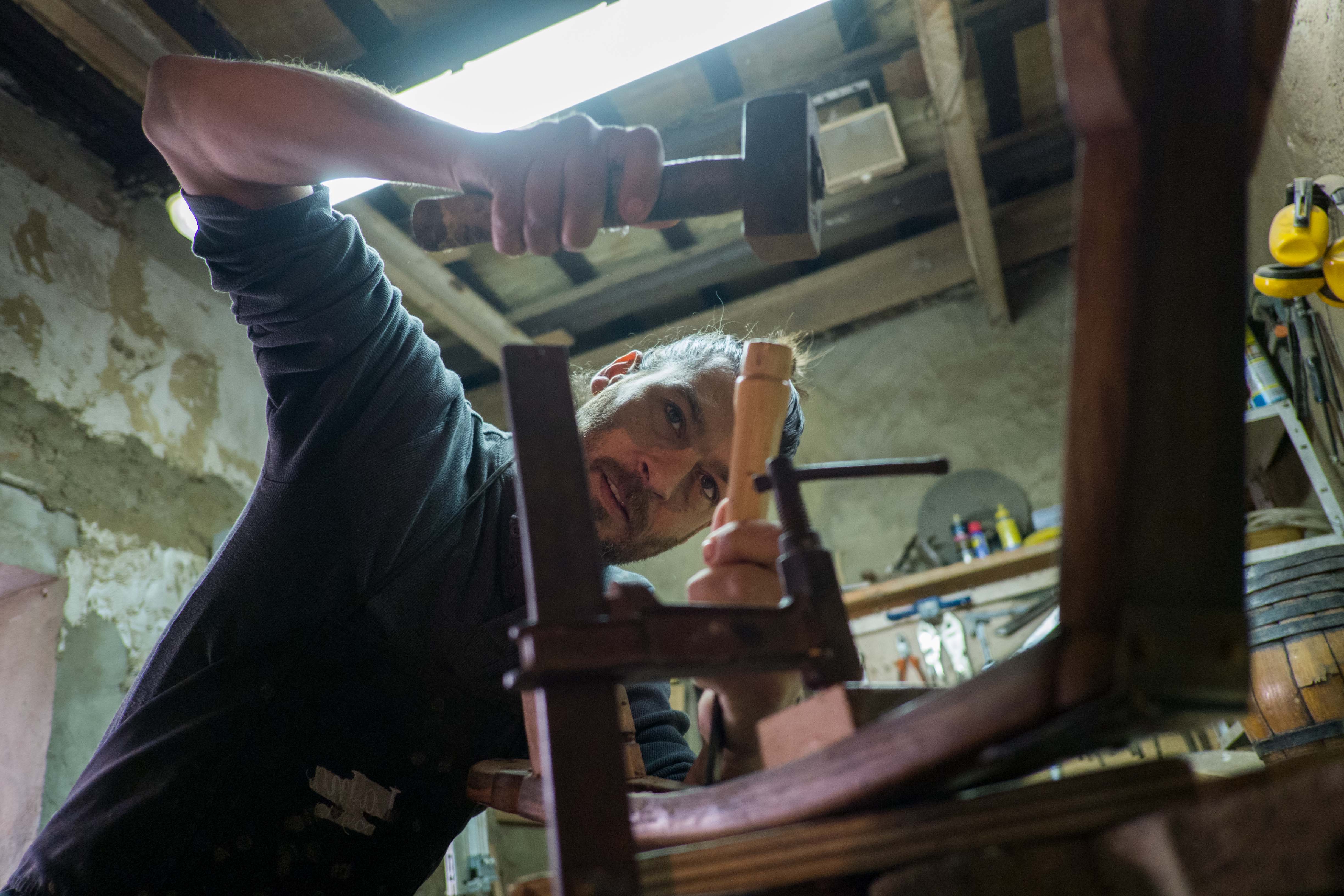 Otro de los elementos característicos del local es su decoración y mobiliario. De eso se encarga Manué, un verdadero artista de la madera. Dejó el Carmen Benítez en el último curso de la EGB para empezar a trabajar. Se enroló en la carpintería de un amigo y ahí aprendió el oficio, paso previo a dar rienda suelta a su innata imaginación desde su taller de la calle Liebre que define como “de la alegría”. Su pasión por el vino le lleva a recorrerse las bodegas para comprar las duelas de botas que ya no se usan y con ellas fabrica bandejas, mesas, sillas, muebles… Pero sus diseños van mucho más allá, hasta el punto de crear originales lámparas con formas de racimo.