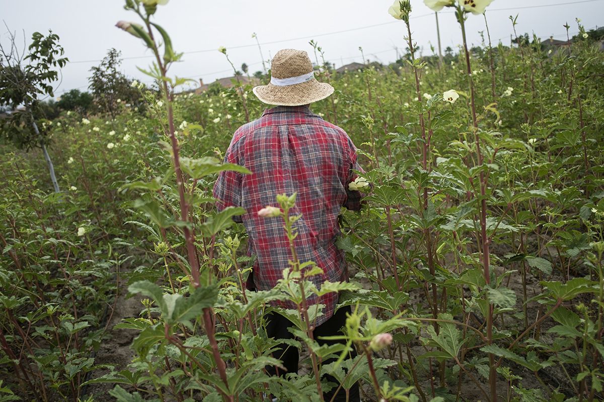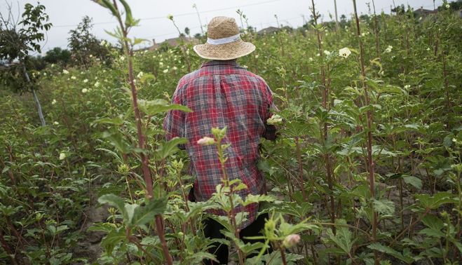 Casimiro García, presidente de La Vicuña, recogiendo okra. FOTO: MANU GARCÍA
