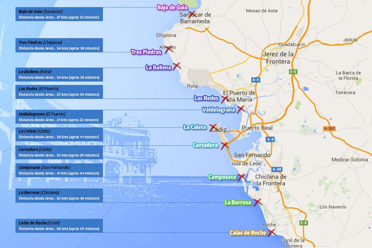 Cádiz tiene 260 kilómetros de costa pero esta es una selección de las playas a menos distancia en coche desde Jerez, la segunda ciudad de la provincia más ocupada en el último verano.