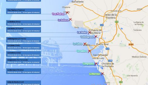 Kilómetros desde Jerez: 35 kilómetros (aproximadamente 29 minutos en coche). Cuenta con estación de tren (Cortadura)