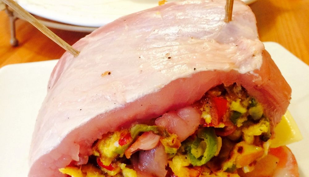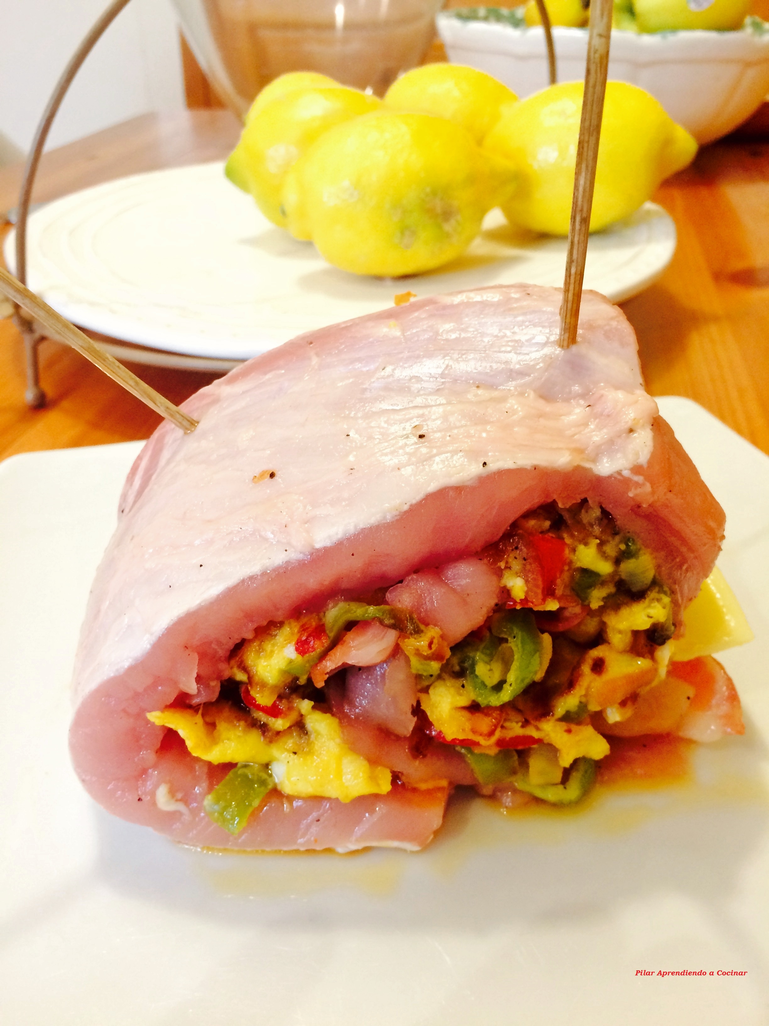 * Y ya estamos listos para enrollar el lomo con el relleno y al final le pinchamos dos palillos largos como en la imagen.