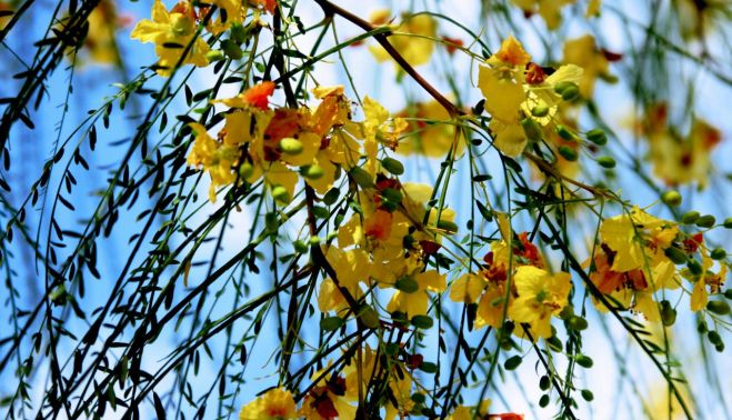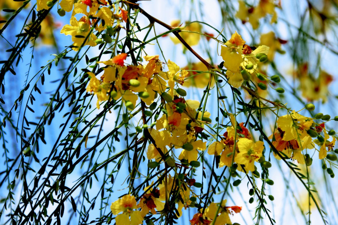 Más escasas, pero igualmente llamativas, son las parkinsonias (Parkinsonia aculeata). Podemos verlas, por ejemplo, escoltando la Avenida de Arcos, entre la rotonda de los Juegos Olímpicos y la de Biarritz. Su copa presenta un aspecto ligero y poco denso, debido al diminuto tamaño de los foliolos de sus hojas compuestas, que cuelgan de sus ramillas espinosas y, por lo general, péndulas, dando un aspecto casi transparente a su follaje. En estos días de comienzo del verano, las parkinsonias se muestran más hermosas que nunca, exhibiendo en sus copas sus racimos de flores con corolas de un intenso color amarillo salpicado de pequeñas manchas rojas.