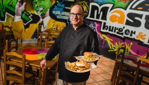 El espacio tipo caserío que ocupaba El Salmorejo, con sus aperos de labranza, sus soportes de madera para botellas de vino, sus manteles de cuadros, se ha transformado en un espacio urbano, las paredes, por obra y gracia de los diseños grafiteros de Sarko y Harfo, son ahora lienzos coloristas que muestran grafismos del streat art y personajes por todos conocidos del cine y la animación televisiva en multicolores murales. El cambio se hizo el pasado septiembre y, desde entonces, Mastika saca un buen número de hamburguesas y pizzas artesanas de su cocina a diario para un público, como nos detalla Fede, de todas las edades.