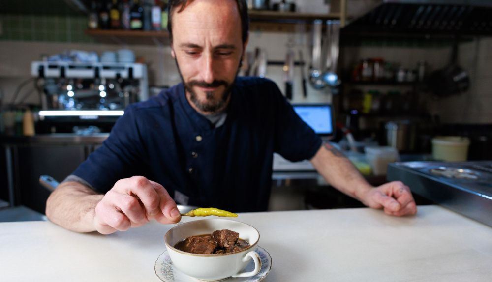 La propuesta de Matria parte de una premisa clara: poner en valor lo que se comía y se sigue comiendo en las casas de Jerez. Riñones al jerez, lentejas de chorizo y manita, puchero, espoleá, torrijas. Platos que en muchos sitios han desaparecido de las cartas o que directamente nunca llegaron a tenerlos. "Desde unos riñones al jerez a una espoleá o las lentejas, el puchero... cositas que son de toda la vida de aquí, pero la gente cuando llega se sorprende", explica David Ripalda.