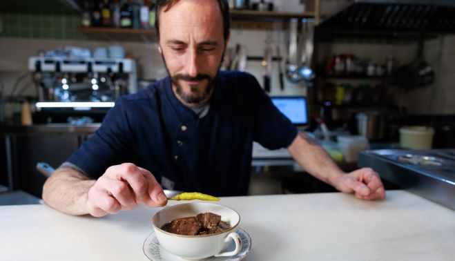 "Hacer algo que le guste tanto a mi padre, que se venga aquí y se tome una tapa de zanahoria aliñada o unas papas aliñadas con pringá del puchero, y a jóvenes que vengan y prueben comida de toda la vida pero con guiño moderno", resume David. Esa es la idea. Y eso llevan a cabo.