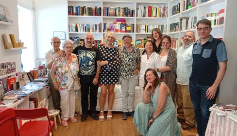 Ya en Madrid, hospedados en Las Rozas, salimos al día siguiente camino de Chamberí, a la Calle Modesto La Fuente, donde María nos esperaba en su coqueta y luminosa librería La Modesta. Allí, encuentro literario con Fernando Mircala y Ricardo Virtanen, buenos amigos y compañeros de hazañas. Un acto concurrido, interesante y emotivo, en el que brindamos con Tio Pepe y Solera 47. Un cachito de mi orilla para compartirla. Me tocaba firmar por la tarde, y la alerta naranja casi nos roza los talones. Calor en El Retiro, sofocante. Pero suelo llevar el viento conmigo, y esta vez saqué del bolso un ponientito largo para que no se derritiera la tinta del boli. Vuelo Rasante, y alas, y más alas. Todos contentos y muchos amigos, la prima María, Mausy, Yola, Tony. Javier, de El Juglar Editorial, y mucho cariño rodeándonos siempre.