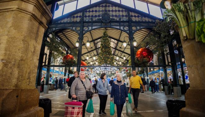 La Plaza, el mercado central de abastos de Jerez, ya luce engalanada desde hace unos días con una extraordinaria decoración propia de las fiestas navideñas. El kilómetro cero de las compras locales se convierte también de esta forma en un auténtico reclamo turístico para los muchos visitantes que llegan a la ciudad coincidiendo con su temporada alta de Zambombas.