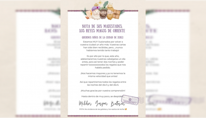Con motivo del adelanto al 4 de enero de la Cabalgata de Reyes Magos de Jerez por las previsiones de lluvia para la tarde del 5, los Magos de Oriente han escrito una carta a las niñas y niños de la ciudad.