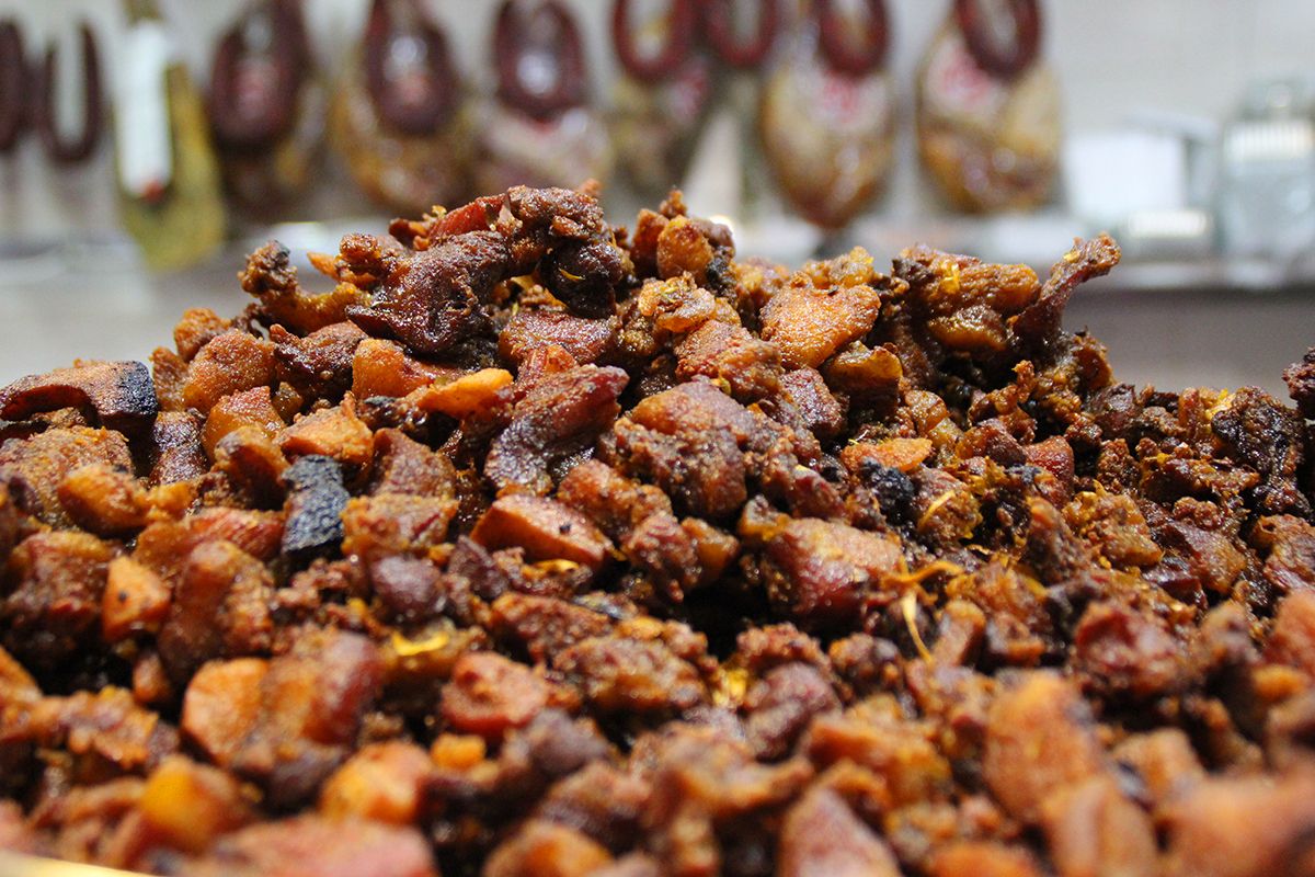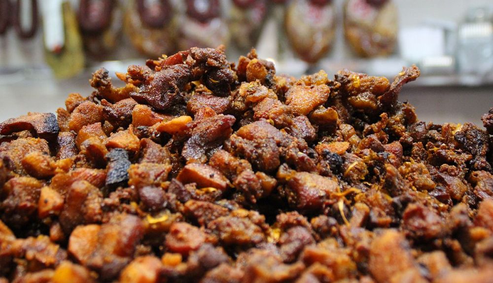 Antonio Ruiz regenta un puesto de carnes en el Mercado de Abastos de Chiclana y realiza casi a diario y de manera casera estos productos. Para ello utiliza aliños naturales e intenta emplear lo menos posible de conservantes. Para Ruiz la diferencia es que el chicharrón especial va cocido en la manteca y el chico va frito. “Utilizo los mismos ingredientes, pero la forma de cocinar es distinta y no tiene nada que ver el sabor”, comenta el carnicero que emplea la panceta –la barriga del cerdo- para sacarle el máximo jugo posible al chicharrón.