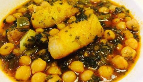 - Este majao, junto con los granos de pimienta, lo vertemos en la olla con los garbanzos, poniéndola a fuego lento durante unos diez minutos, y cinco minutos antes de apartarlo, se le añadirán los taquitos de bacalao. Y listos para emplatar y disfrutar de este rico guiso.