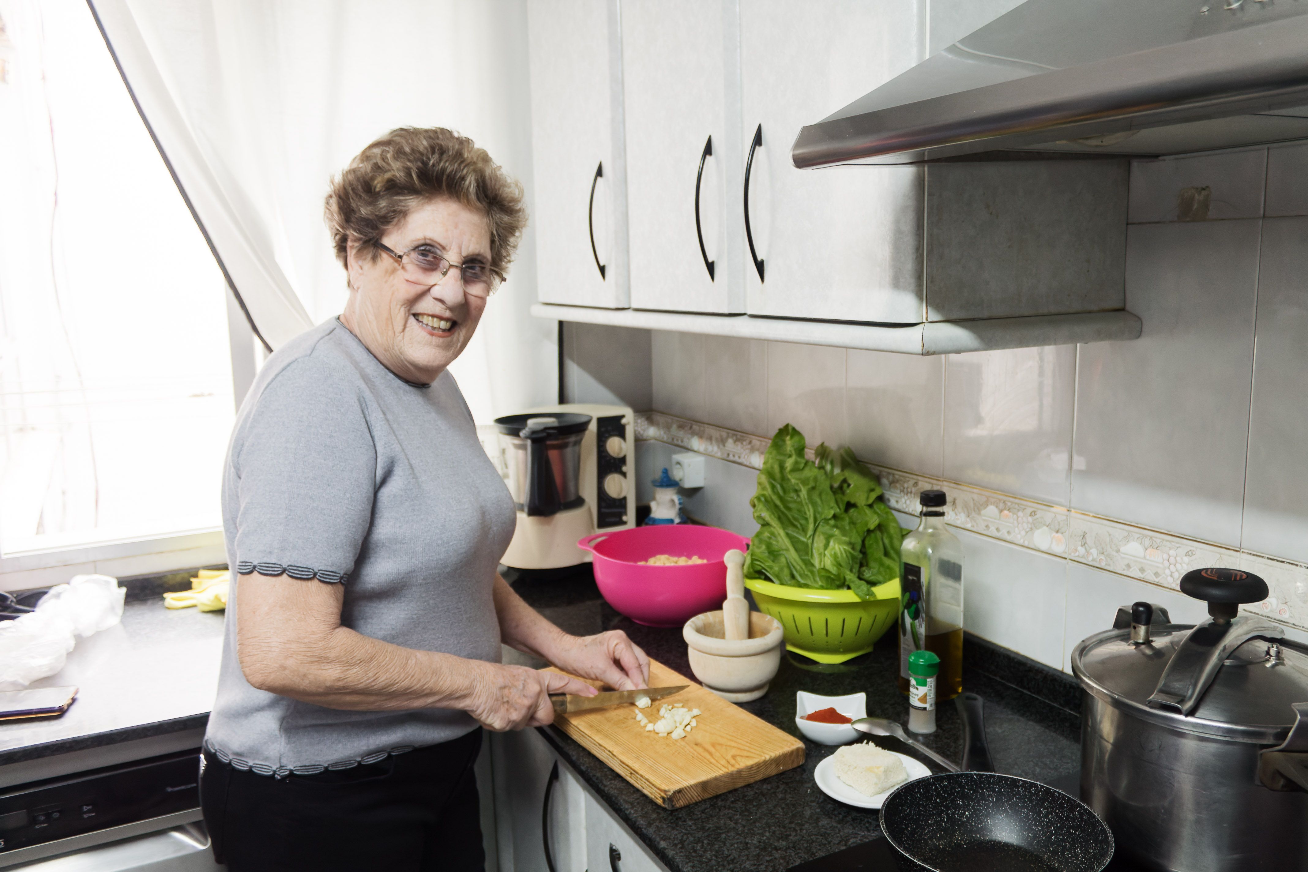 En su cocina, corta los ingredientes para hacer garbanzos con acelgas mientras cuenta que allí, todo funciona a base de creatividad y aprovecharlo todo. Al lado de esta amante de los potajes—”son mi locura”—a la que no le gusta el huevo frito por el candiel que su madre echaba al puchero porque “era muy canija”, se encuentran tres mujeres que no pueden evitar sonreír cada vez que su amiga abre la boca.