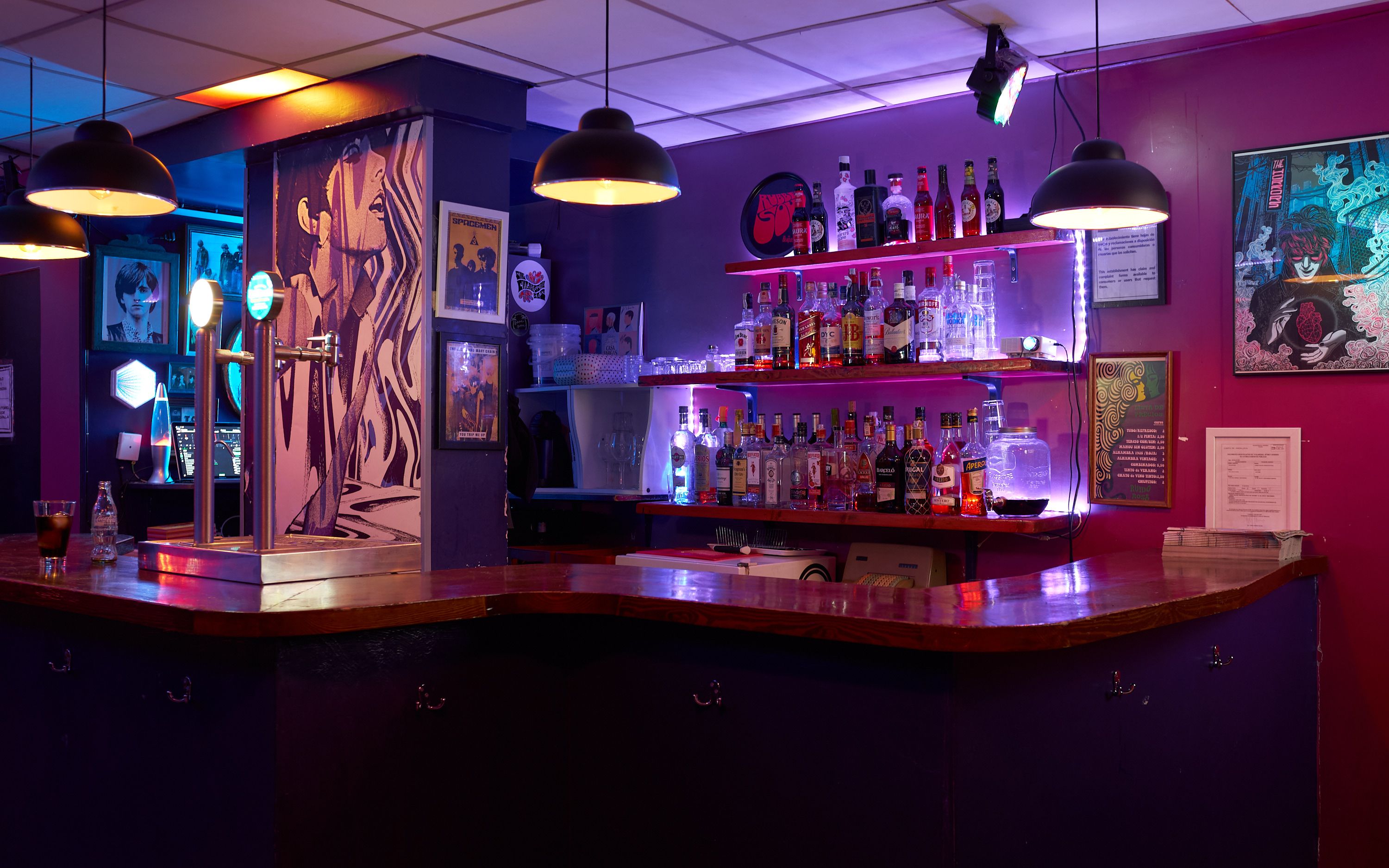 La artista granadina, Vanesa Zafra, fue la encargada de crear la identidad del nuevo bar, con diseños marcadamente psicodélicos en tonos morados, rosas, blancos y negros. "La decoración y el ambiente colorido de luces continúa, pero ahora tienen cabida tanto el post punk, como el shoegaze, la new wave, el acid, la música electrónica…", matiza Sergio, que asegura que ahora "lo mismo suenan artistas actuales como Cupido o Dry Cleaning, que algún tema de ese pedazo de grupo pop que es Abba". Y aprovecha para recordar que uno de "los momentazos de cada noche" es el Take On me de A-Ha. "Otro de mis innumerables 'guilty pleasures'", reconoce con su particular cachondeo.