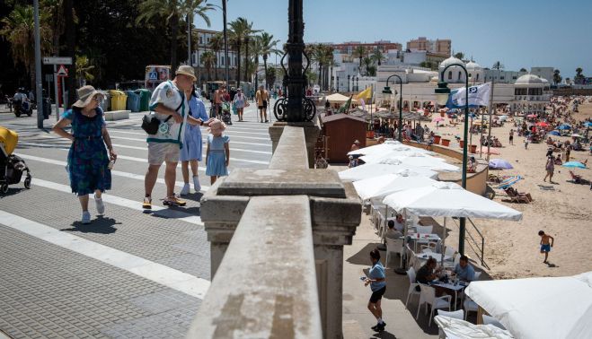 La terraza del Club Caleta es el palco más viñero y gaditano que pueda existir. El mejor mirador con vaso, copa o plato sobre la playa de plata quieta. Es tan tradicional que está labrado en piedra ostionera. Eso sí, ahora puede leerse en inglés, oyster stone, en el nuevo uniforme del personal.