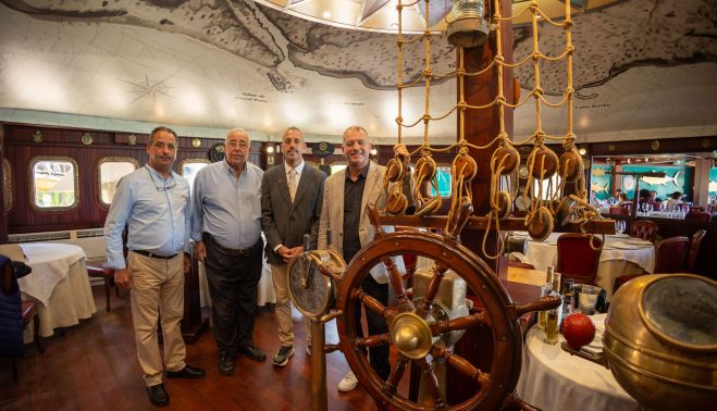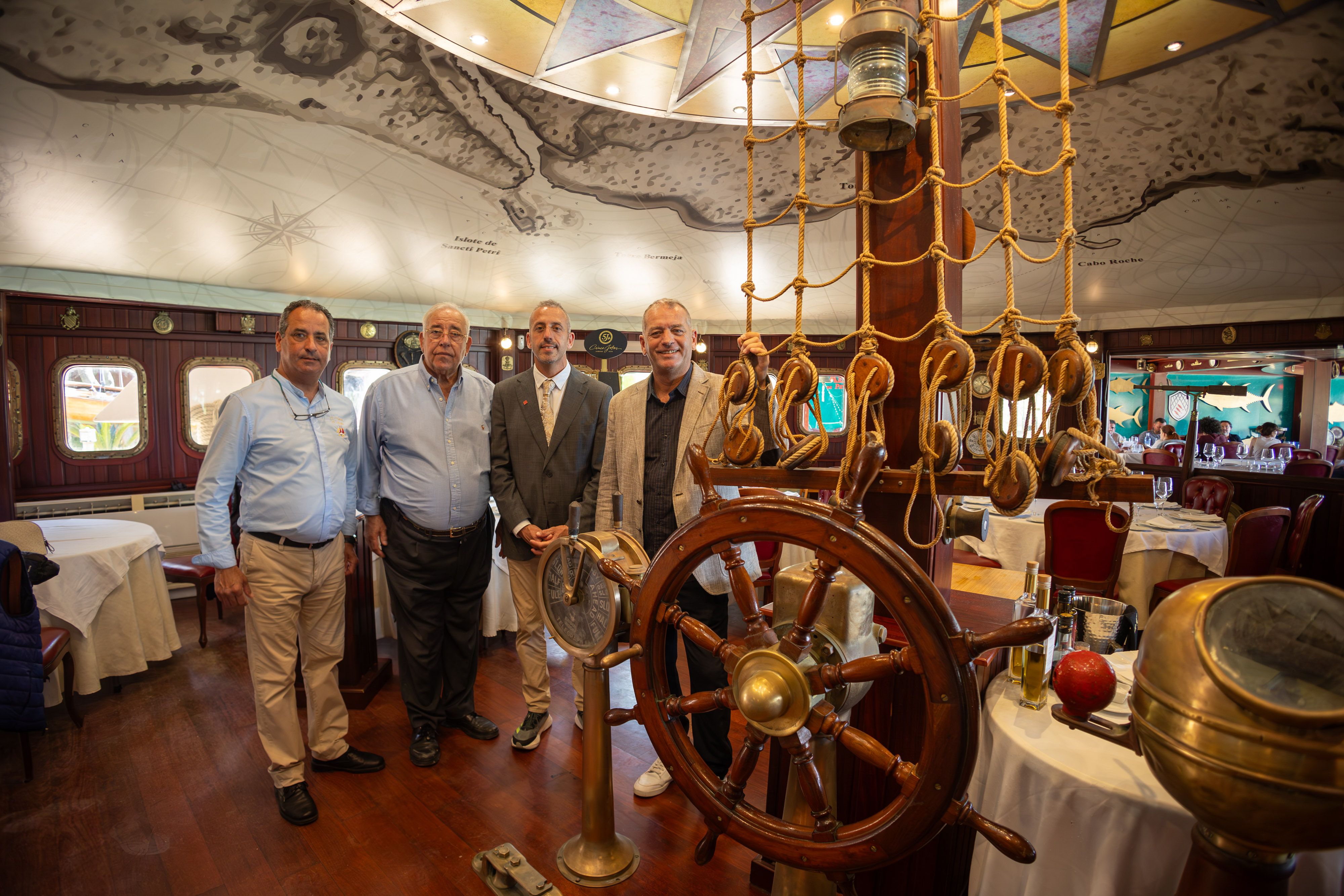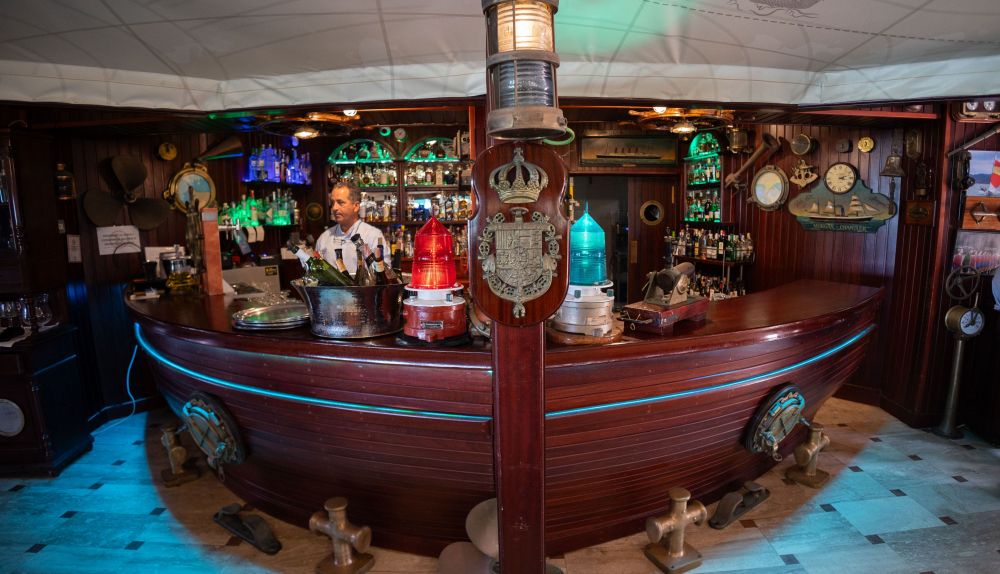 Dos barcos, uno danés de 1952 que estuvo en una regata de Alemania y otro fabricado en los años 60 que fue bronce en una olimpiada de Roma, dan la bienvenida a los comensales. Hay una hélice de bronces con cinco palas, católicos que se usan para amarrar los barcos al muelle, un ancla gigante, correderas que antaño se usaban para medir la velocidad, catalejos, un cañón de abordaje del siglo XV y portillos de bronces. “Esto parece más un club náutico que un restaurante”, bromea Pepe mientras se adentra en el interior.