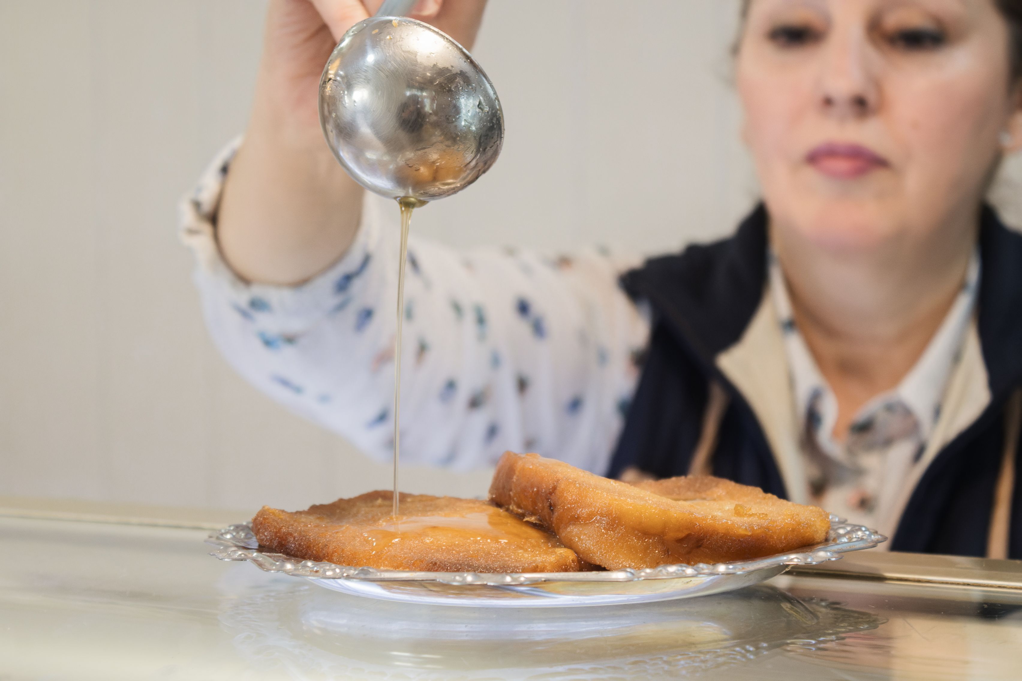 La torrija tradicional no tiene secretos para Sonia. Es la que se hace con sabor a jerez “que es la típica de aquí. Lleva fino u oloroso y miel”. El proceso es el que sigue: “la hacemos con pan de molde, la mojamos en vino fino y la coloreamos un poquillo de harina por las dos caras y la pintamos con huevo en ambas caras. Se fríe y se va poniendo en un recipiente en el que le añadimos un almíbar hecho de miel, azúcar y agua. Así ya estaría lista”.