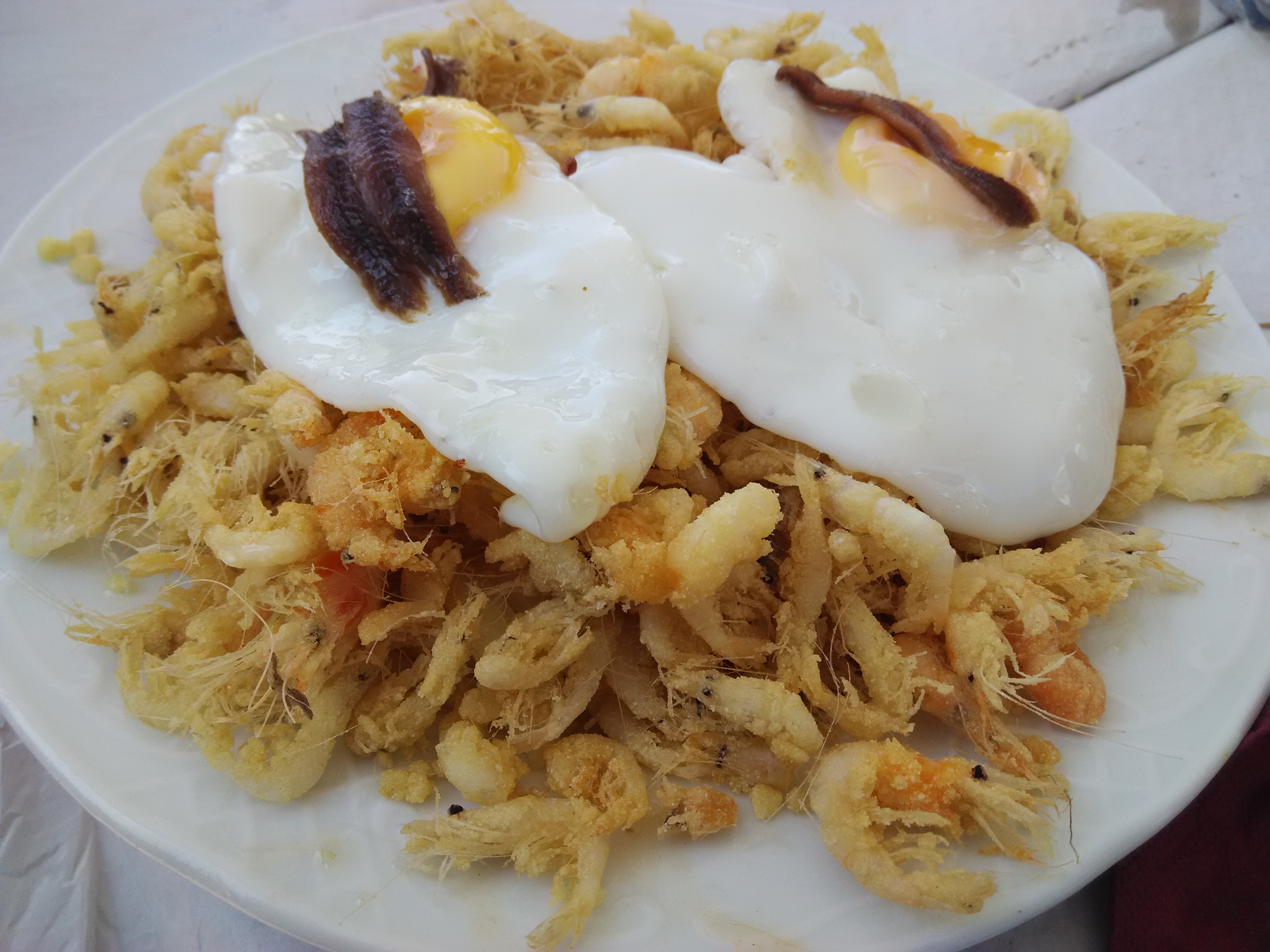 Como no podía ser menos, los camarones tienen también protagonismo. Aquí se preparan fritos, en un plato denominado “popurrí tierra y mar”, ya que los combina con pimientos fritos y huevo; al ajillo o en tortillitas, siendo abundantes y bien grandes, prácticamente quisquillas. Destaca igualmente en la carta las huevas de bacalao al ajillo, el pescadito frito, y los pescados de estero, lubina y albur, así como los langostinos.