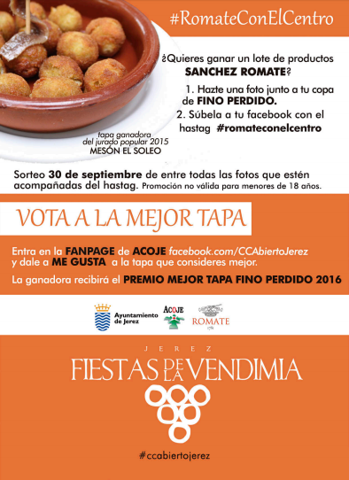 Entre plato y copa, los promotores de este recorrido culinario también han diseñado un concurso para impulsar la participación en esta ruta del tapeo y en el festejo de la vendimia. Los ciudadanos tienen la posibilidad de ganar obsequios solo con asistir al centro y usar las redes sociales. ¿El premio? Sánchez Romate sortea un lote de sus productos entre las personas que se hagan una foto junto a su copa de fino Perdido y la suban a su página de Facebook acompañados del hashtag #romateconelcentro. A pesar de que las Fiestas de la Vendimia concluyen el 18 de septiembre, el día 30 es la fecha acordada para realizar el sorteo entre las fotos que incluyan dicha etiqueta.
